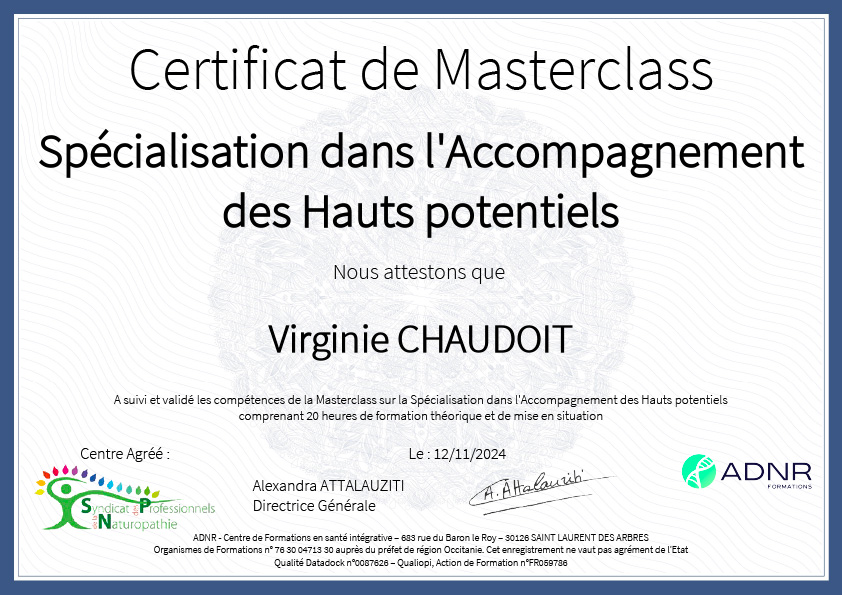Spécialisation sur la prise en charge du haut potentiel et de l’hypersensibilité en naturopathie.